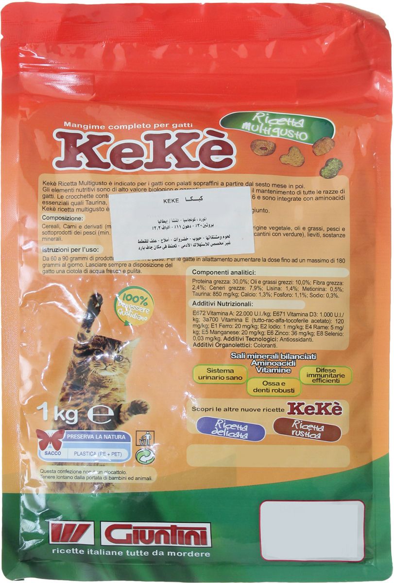 Keké Ricetta Multigusto عبارة عن علف كامل للقطط التي يزيد عمرها عن 6 أشهر. وصفة Kekè متعددة المذاق مناسبة حتى للقطط الصعبة ، من عمر 6 أشهر. تمت صياغة هذا النظام الغذائي لتوفير العناصر الغذائية ذات القيمة البيولوجية العالية ، مما يضمن النمو الأمثل والحفاظ على جميع سلالات القطط. تحتوي الأطعمة اللذيذة على اللحوم والأسماك والخضروات وأحماض أوميغا 3 وأوميغا 6 الدهنية والأحماض الأمينية الأساسية مثل التورين والليسين والميثيونين. وصفة Keké متعددة المذاقات هي نظام غذائي مليء بالطعم ، بدون ملح مضاف